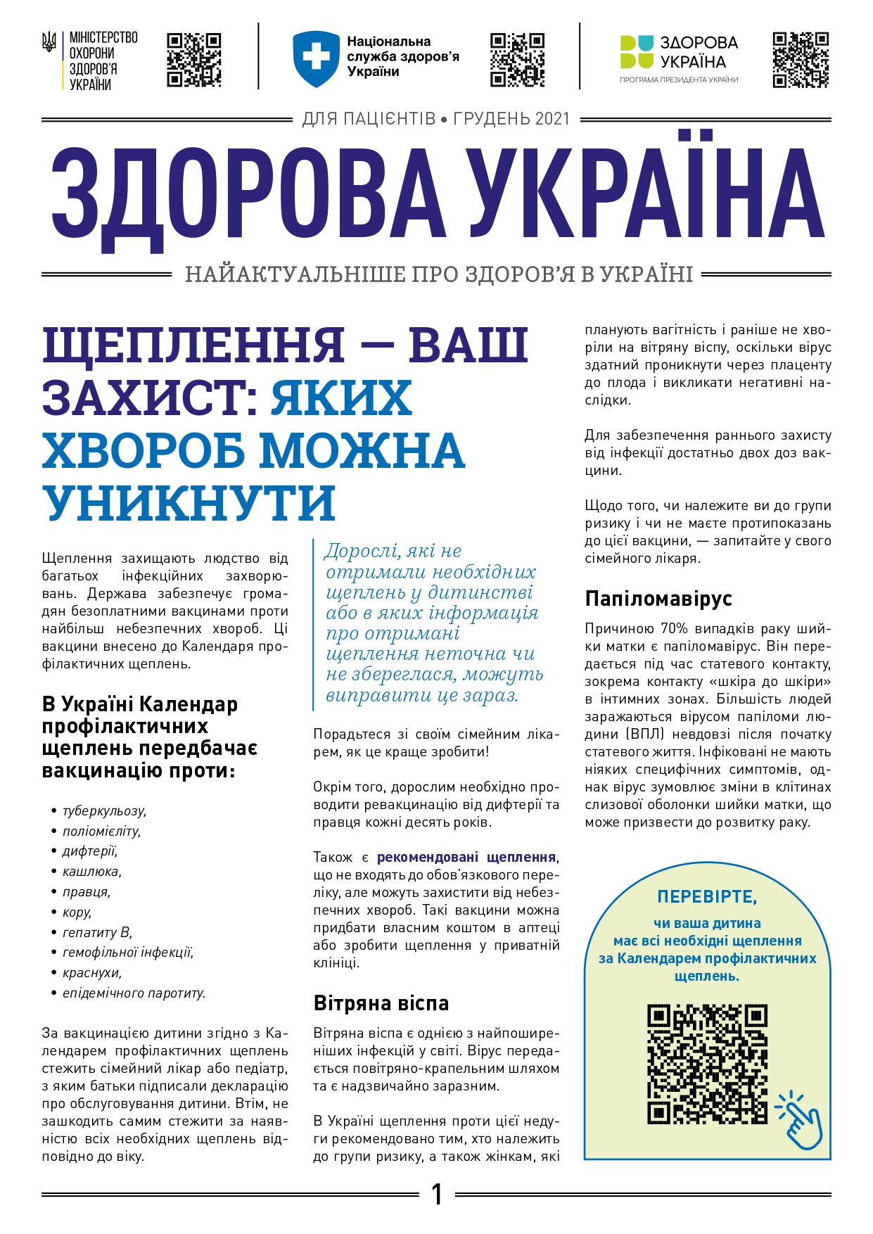 Здоров'я українців залишається найважливішим пріоритетом країни й дотримання Календаря щеплень відіграє в цьому ключову роль. В умовах воєнного стану імунізація — чи не найбільш ефективний метод убезпечити себе та своїх дітей від тяжких захворювань та їхніх наслідків.